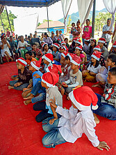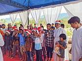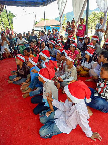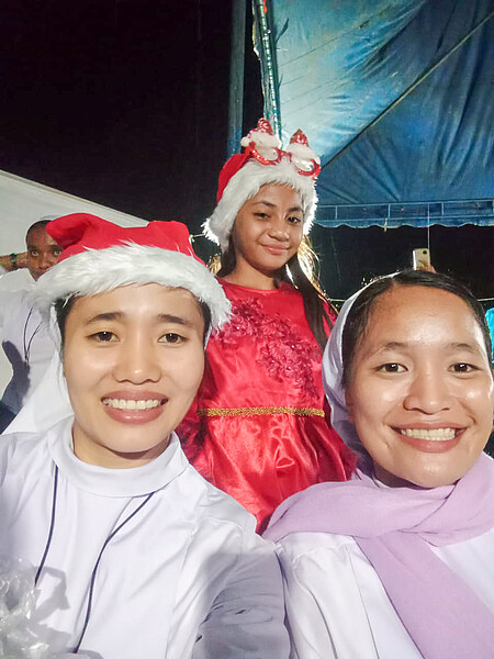 Pater Purwo OSC sowie mehrere Schwestern begleiteten die Geflüchteten an Heiligabend. Ein kleiner Weihnachtsbaum mit einfachen Lichtern und ein provisorischer Altar verliehen der Feier eine stille Würde. Regen und Wind machten die Nacht kühl, doch die Schwestern brachten Wärme, indem sie den Kindern rote Weihnachtsmützen schenkten und ihnen ein Lächeln zurückgaben.