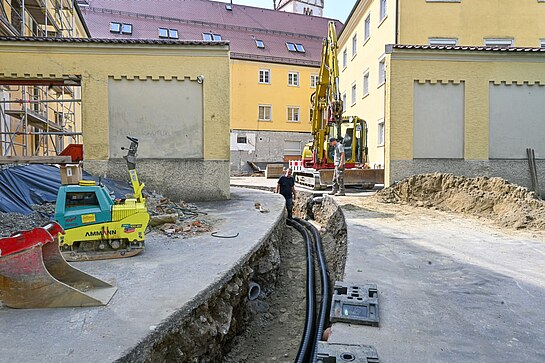 Im Fokus steht nun die Weiterentwicklung des weitläufigen Wärmenetzes. Wird die Wärme für Heizung und Warmwasserbereitung bis dato noch von zwei Blockheizkraftwerken erzeugt, die fossiles Gas verbrennen, ergänzen zukünftig vier neue, hocheffiziente Wärmepumpenaggregate die Wärmeerzeugung. In den Sommermonaten können diese die benötigte Wärme nahezu alleine bereitstellen und in der kalten Jahreszeit helfen sie, die Laufzeiten der Blockheizkraftwerke und die Verbrennung des fossile Brennstoffs Gas zu senken. So können jedes Jahr rund 108 Tonnen des schädlichen Klimagases Kohlendioxid vermieden werden. Nach zwei Jahren Vorarbeit im Projektteam um Bettina Eilers-Häußler können die Planungen nun umgesetzt werden. Ab 4. August wurde in der Klostergasse gegraben, um unser Mutterhaus an das Wärmenetz anzubinden. Ab Ende August beginnen dann die Umbauarbeiten in unseren Technikzentralen und zum Herbst sollen die Wärmepumpen einsatzbereit sein.